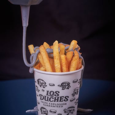 Papas a la francesa, tocineta, guacamole, queso crema, mayonesa de berenjena, proteína de res