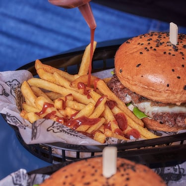 Pan brioche, carne de hamburguesa, mozarella, mermelada de tocineta, mayonesa de ajo negro, queso crema, cogollo europeo