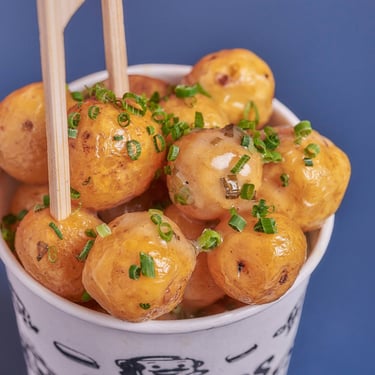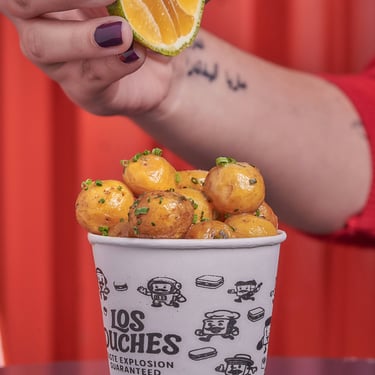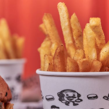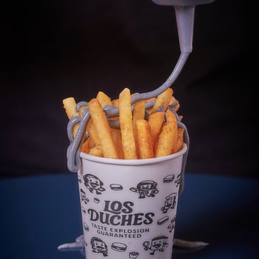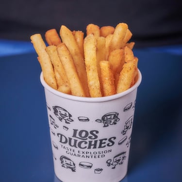 Papas a la francesa, tocineta, salsa especial, queso mozarella, nuggets de pollo en tempura, mermelada de pimentón