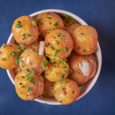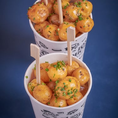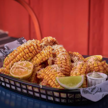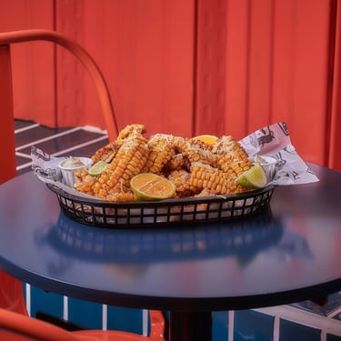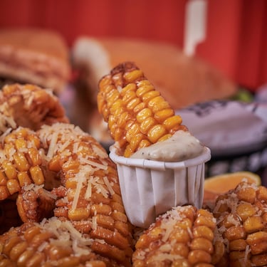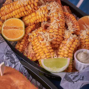 Maíz dulce y crocante, parmessano, limón mandarino y tahití, mayonesa de berenjena y mermelada de pimentón
