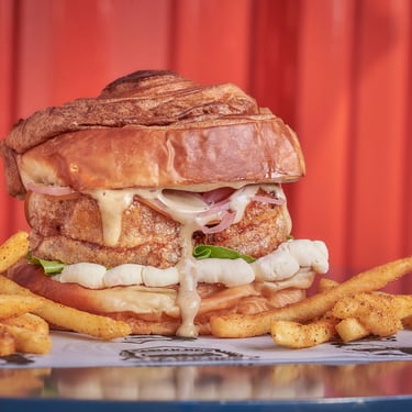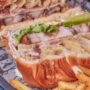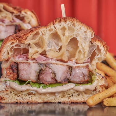 Pan croissant, porchetta 140 g, queso crema, cogollo europeo, reducción balsámica, cebolla encurtida, mayonesa trufada