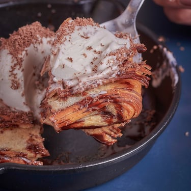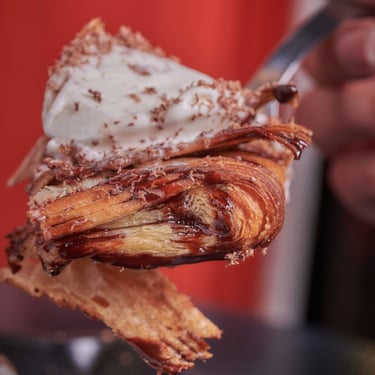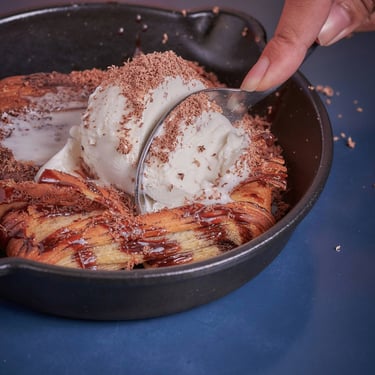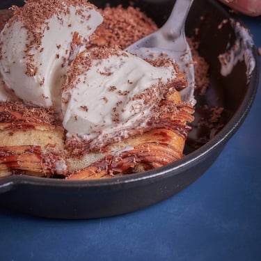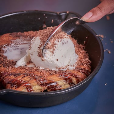 Hojaldre con relleno de chocolate, helado de vainilla y rayadura de chocolate