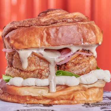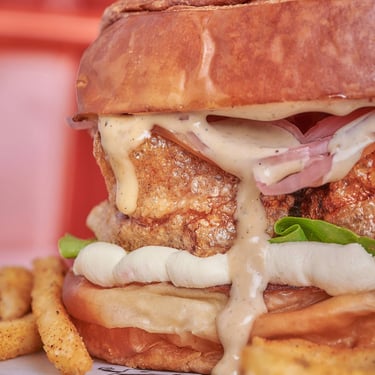 Pan brioche, pollo en tempura, queso crema, cogollo picado, salsa de chile morita, pepinillos, miel especiada